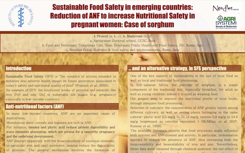 As already done in 2011 (24 October 2011) Ilaria Proietti represents NOODLES at the annual Congress “Prevenzione primaria delle malformazioni congenite” (Primary prevention of congenital malformations) held at the Istituto Superiore di Sanità (Italian national institute of health). The contribution presented in 2011 (“Sustainable Food Safety in emerging countries: Reduction of ANF to increase Nutritional Safety in pregnant women: Case of sorghum”) is now followed by the contribution titled “A staple food-based approach to improve maternal-foetus nutrition in Africa: preliminary findings”.
